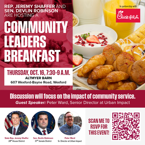Rep. Wendy Fink (R-Red Lion) and Sen. Dawn Keefer (R-York/Cumberland) have been leaders in exploring solutions to the property tax crisis. They will be speaking at a town hall I am hosting with Rep. Aaron Bernstein (R-Butler/Lawrence) and Rep. Roman Kozak (R-Beaver) on Thursday, Nov. 20, from 6-7p.m. at the West Deer American Legion, 57 Superior Road, Tarentum.